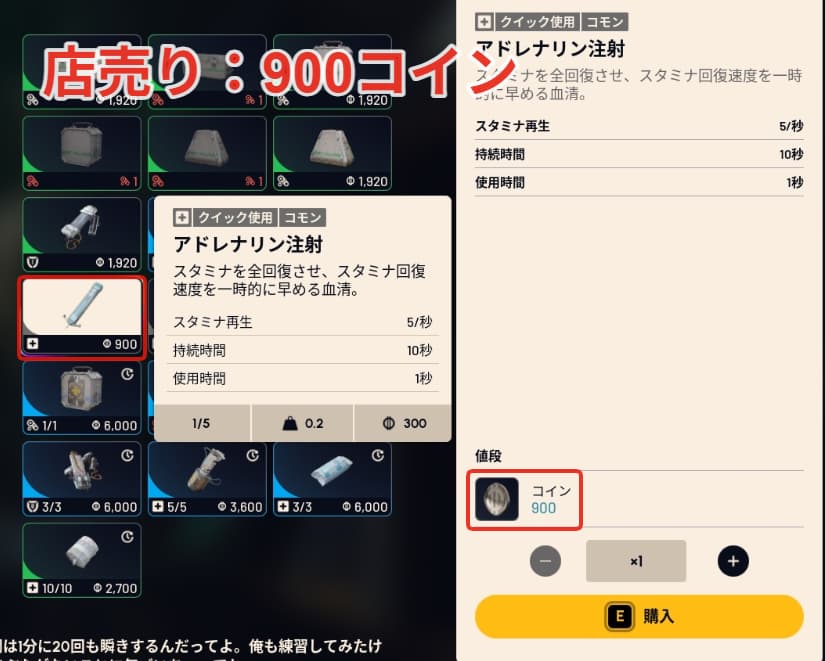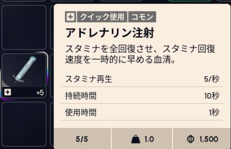 アドレナリン注射は減ったスタミナを全回復させ、10秒間スタミナの回復速度が高まります。