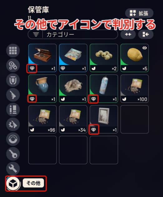 売る際はその他のカテゴリーから宝石のアイコンが付いているアイテムを売っていきましょう。