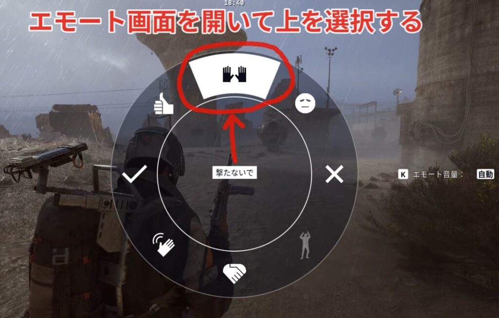 【撃たないで】はエモート画面(PC版はGキー)を開いて上を選択しましょう!