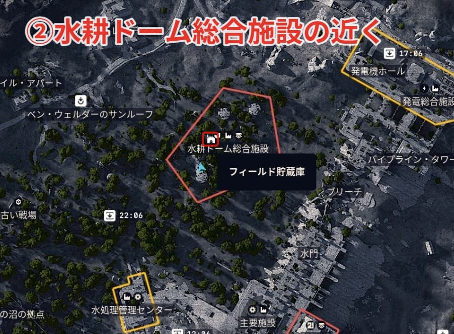 水耕ドーム総合施設の近くにフィールド貯蔵庫があります。