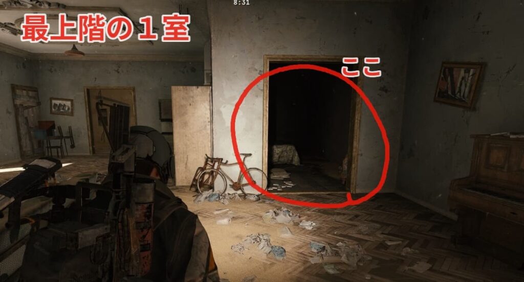 最上階の1室(自転車が入口に置かれている)に向かいましょう。