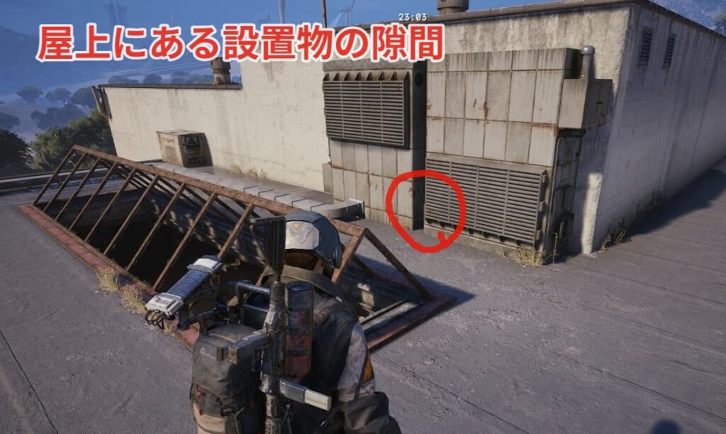 屋根上に登って画像の場所に向かいましょう。