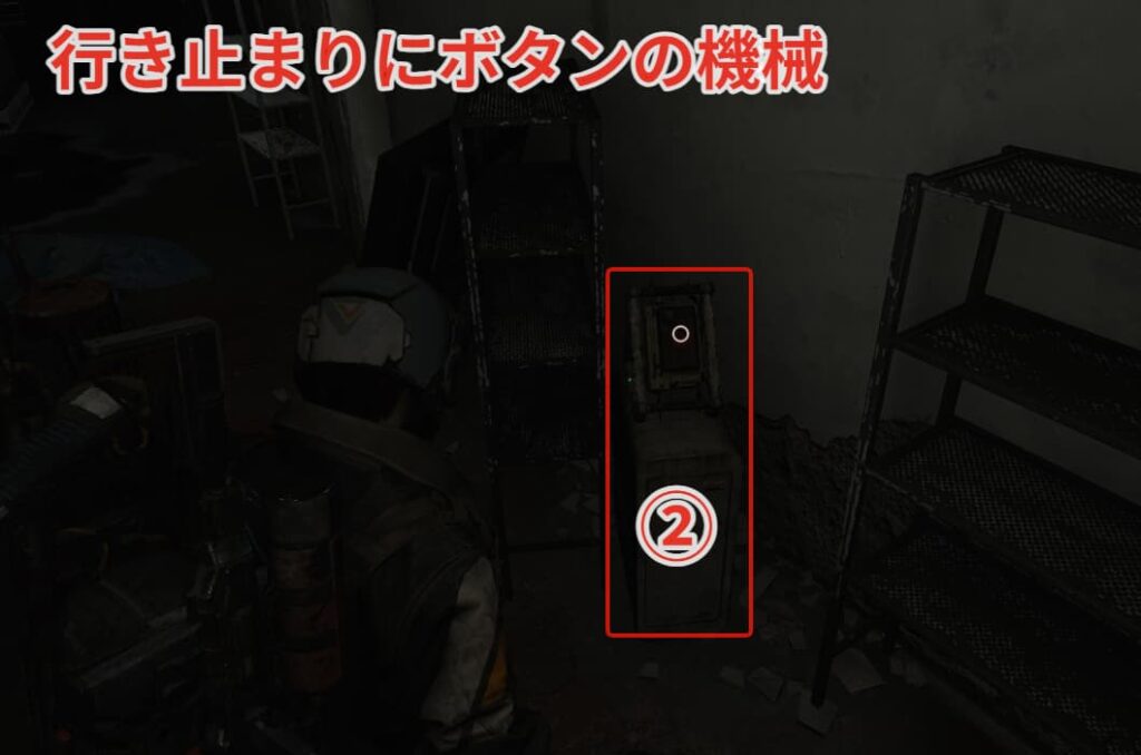 ジップラインで降りて左側の行き止まりにボタンの機械がある