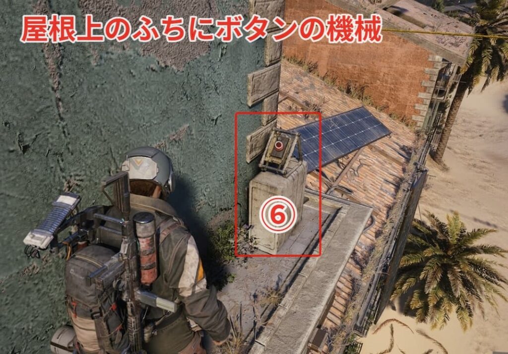 ⑥ボタンの場所はピアッツァ・アルブストにある突破して入る薬局の屋根上です。