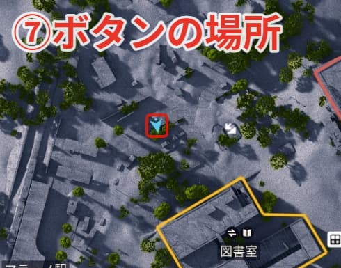 ⑦ボタンの場所は図書室から北側に少し離れた場所にあります。