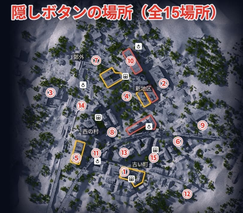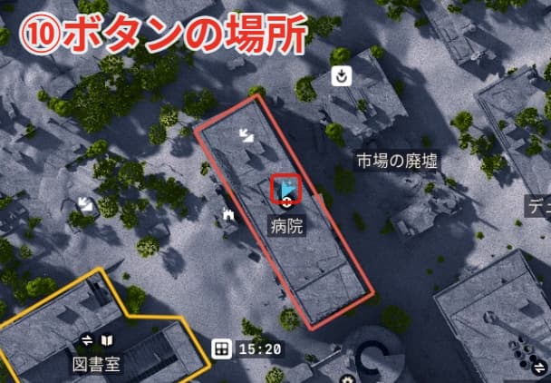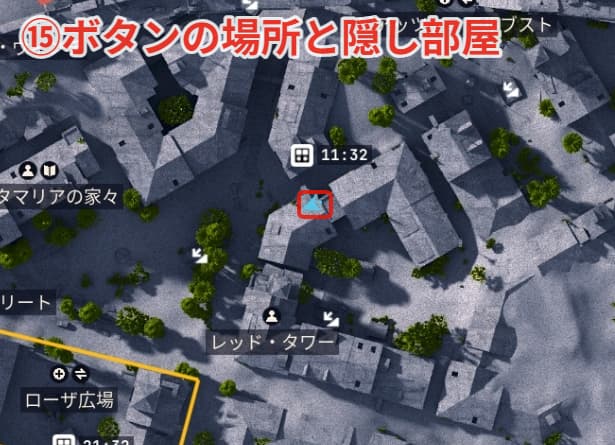 最後の⑮ボタンの場所と隠し部屋はレッド・タワーの真北の建物1階です。
