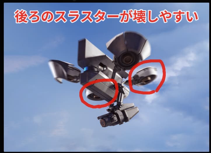 ホーネットの弱点は4箇所あるスラスターです。特に後ろの2箇所は装甲が付いていないので壊しやすくなっています。