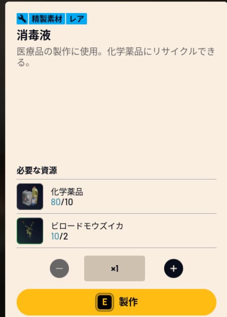 精錬機がlv2になっていれば化学薬品8+ビロードモウズイカ2で消毒液を製作することができます。
