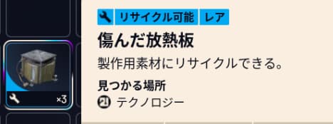 傷んだ放熱板は【テクノロジー 】エリアで出現しやすいです。