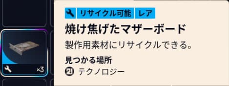 焼け焦げたマザーボードは【テクノロジー 】エリアで出現しやすいです。