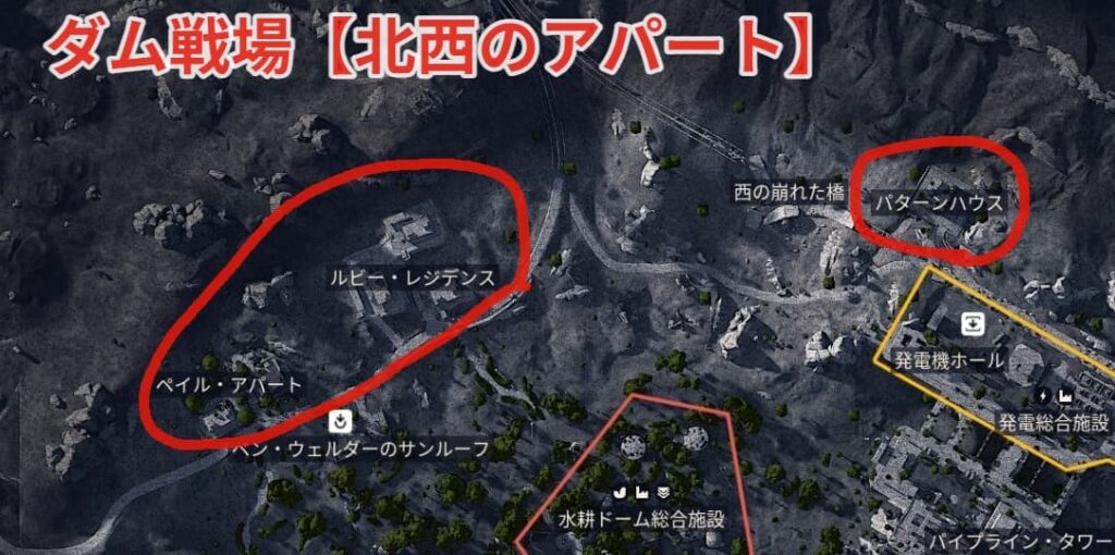 個人的にお勧めはダム戦場にある北西のアパート群です。