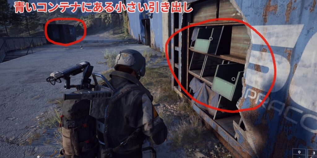 倉庫の外と倉庫内に青いコンテナが置いてあり、小さい引き出しを漁ることが出来ます。