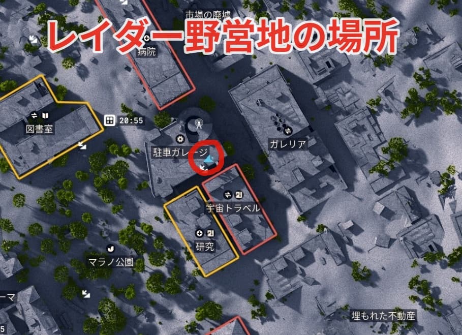 ①埋もれた街で駐車ガレージの下にあるレイダー野営地のコンテナ2個調べる