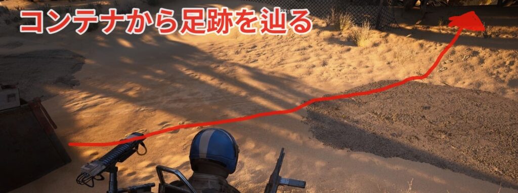 コンテナから砂場へ足跡があるので追いかけましょう。