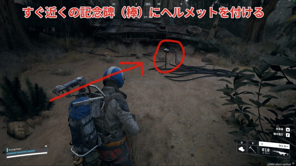 残骸近くの草にヘルメットがかくれているので拾いましょう。
