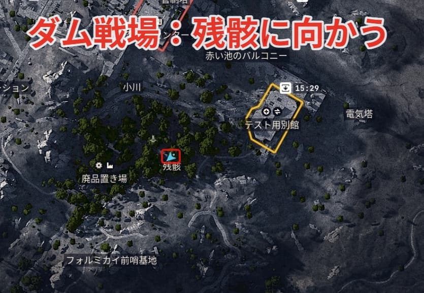 ダム戦場の残骸に向かいましょう!画像の位置がヘルメットの位置です。
