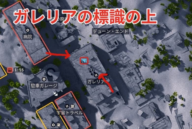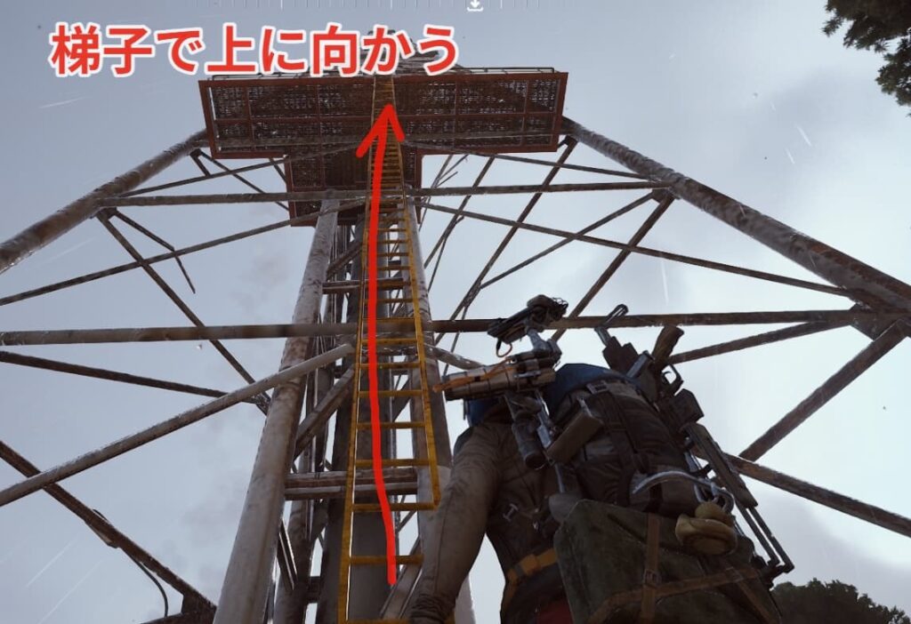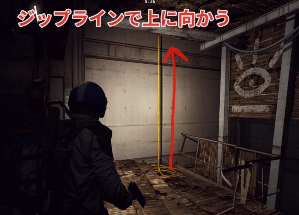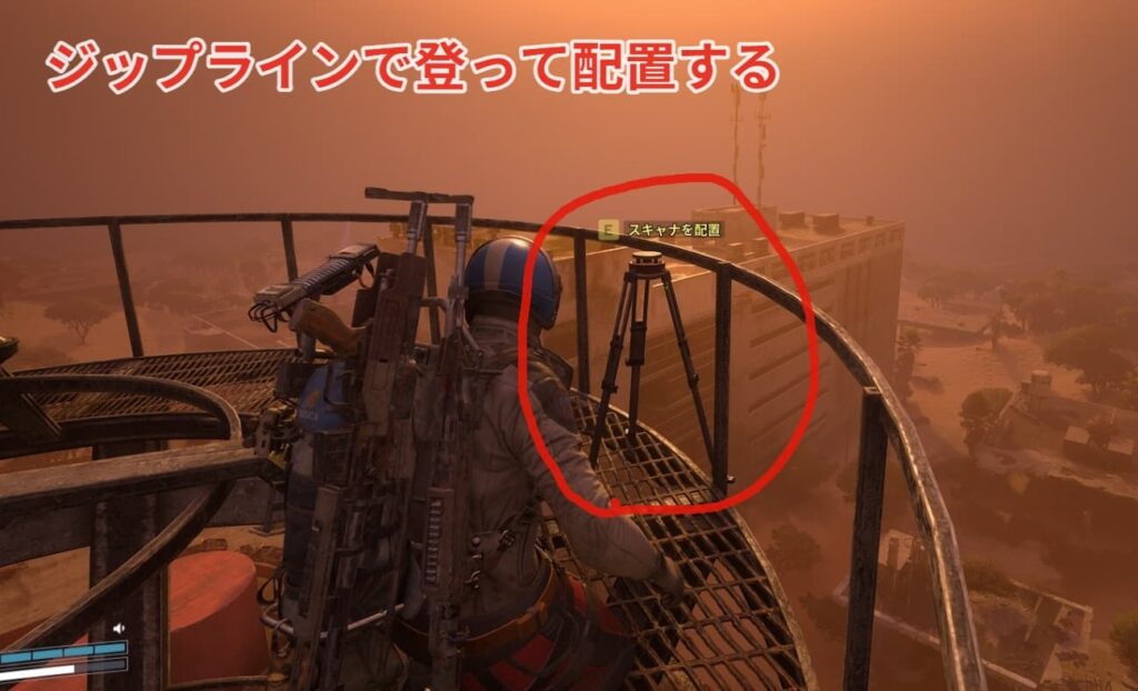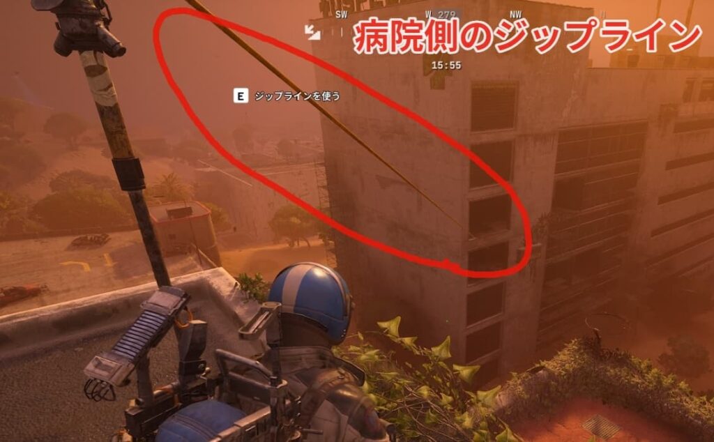 病院側から配置されているジップラインか、南側から飛び乗って向かいましょう。