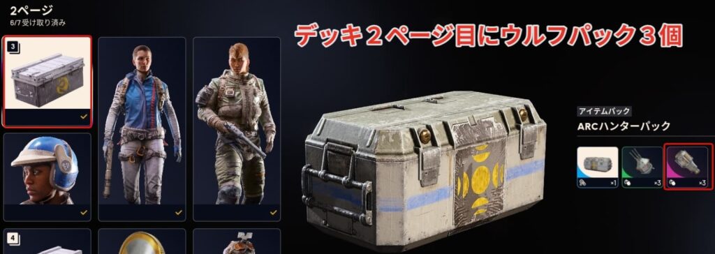 ウルフパックはデッキ2ページ目のアイテムパックで3つ手に入ります。