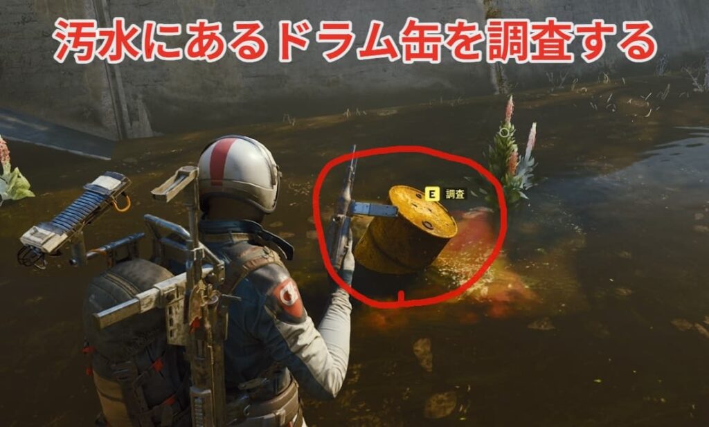 汚水のエリアにドラム缶があるので調査すればクリアです。