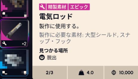 手っ取り早く終わらせたい方はレジェンダリー【スナップ・フック】をリサイクルすると電気ロッドが手に入ります。