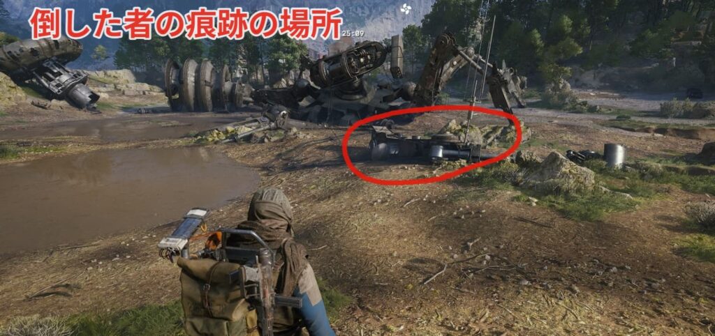 不毛な空地に到着後、①に向かって倒した者の痕跡を調査しましょう。