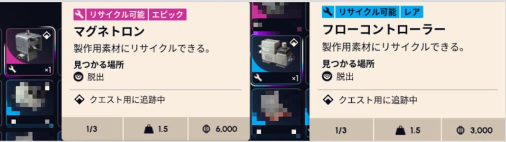 マグネトロン・フローコントローラーは【脱出】のエリアで拾いやすいです。