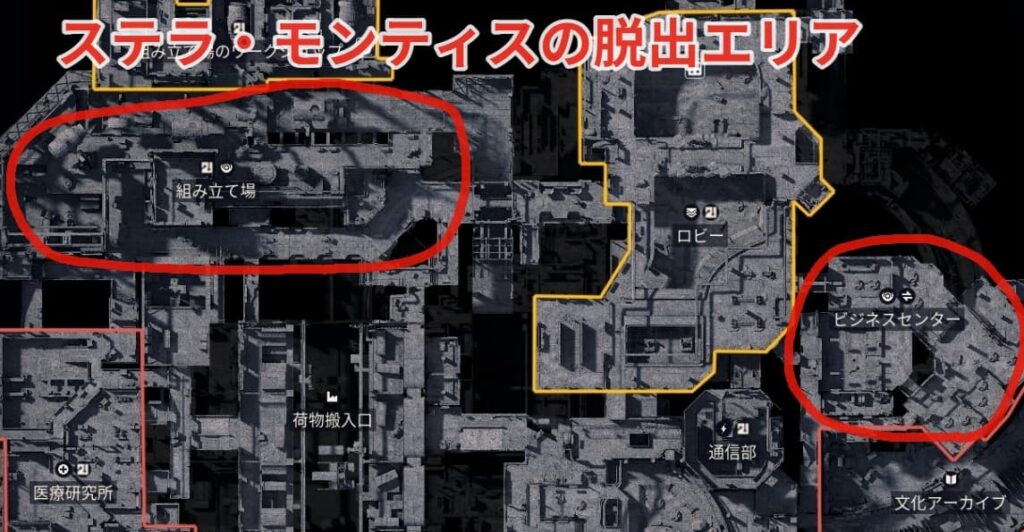 組み立て場とビジネスセンターが脱出のエリアになりますのでそちらを漁ってみてください。