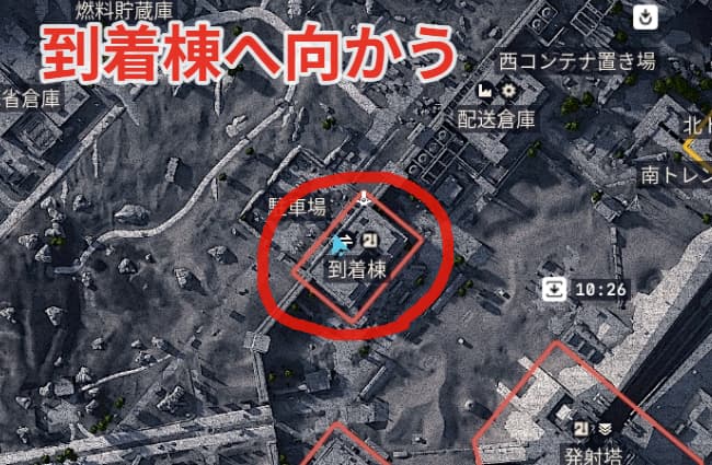 次に発射筒の裂け目を超えて到着棟へ向かいましょう。