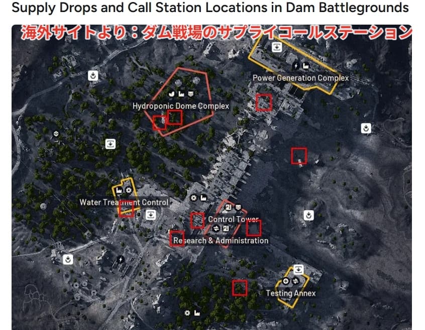 まだゲームの情報が少なすぎて本当か検証もできていませんが、ダム戦場のサプライコールステーションが湧く場所の一覧が下記の画像のようです。