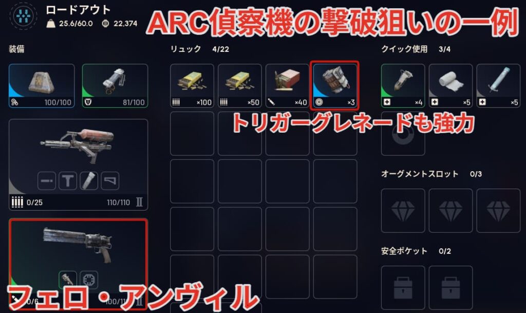ARC偵察機の撃破には大型弾薬のフェロ・アンヴィル辺りを持っていくと倒しやすいです。