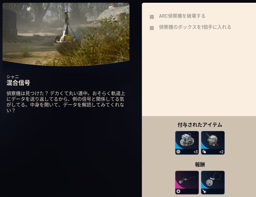 混合信号では黒い球体のARC偵察機を見つけて撃破し、偵察機のボックスを手に入れる必要があります。