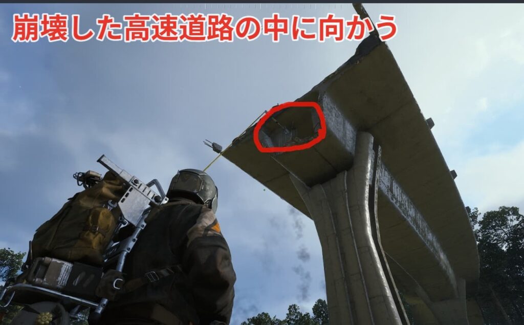 崩壊した高速道路の先に空洞のスペースがあるのでそちらの中に向かいましょう。
