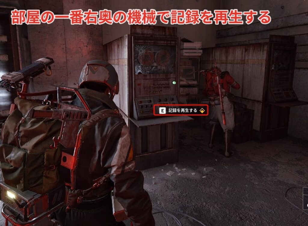 部屋のシャッターが開いたら奥まで進んでモニターの右にある機械で記録を再生しましょう。