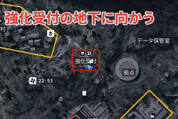 まずはブルーゲートの強化受付に向かい、縦ジップラインで地下施設に向かいましょう。