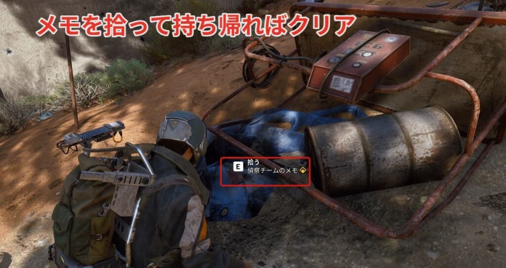 偵察チームのメモが落ちるので拾って持ち帰ればクリアです!