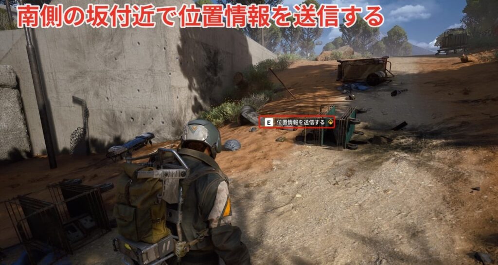 メンテナンス格納庫の南側に坂があり、そこで位置情報を送信できます。