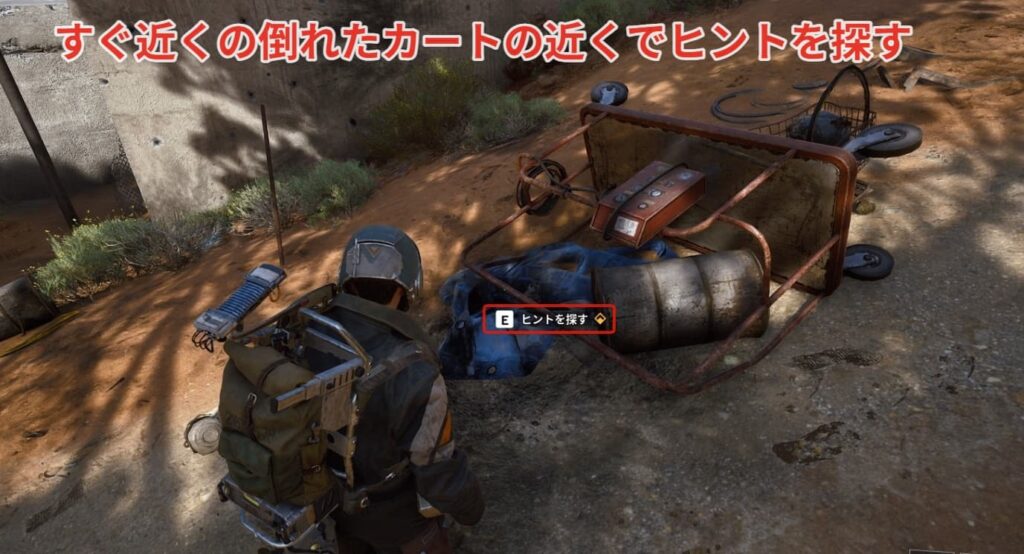 位置情報を送信したすぐ近くの倒れたカートでヒントを探しましょう。