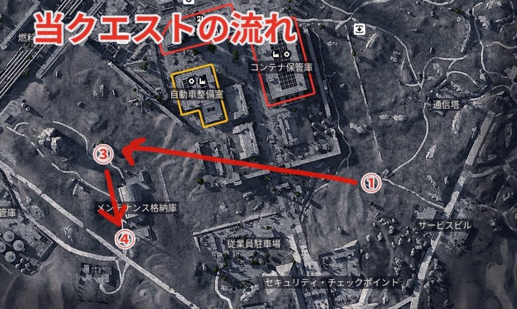 埃をかぶった配線では3カ所を移動してクエストが進んでいきます。(番号は↑の①・③・④の場所)
