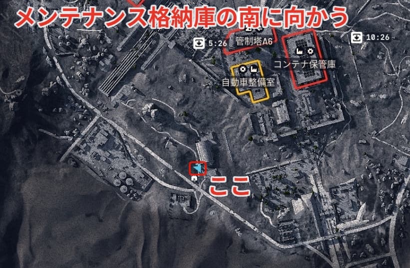 ④メンテナンス格納庫の近く(南側)で偵察チームの痕跡を見つける