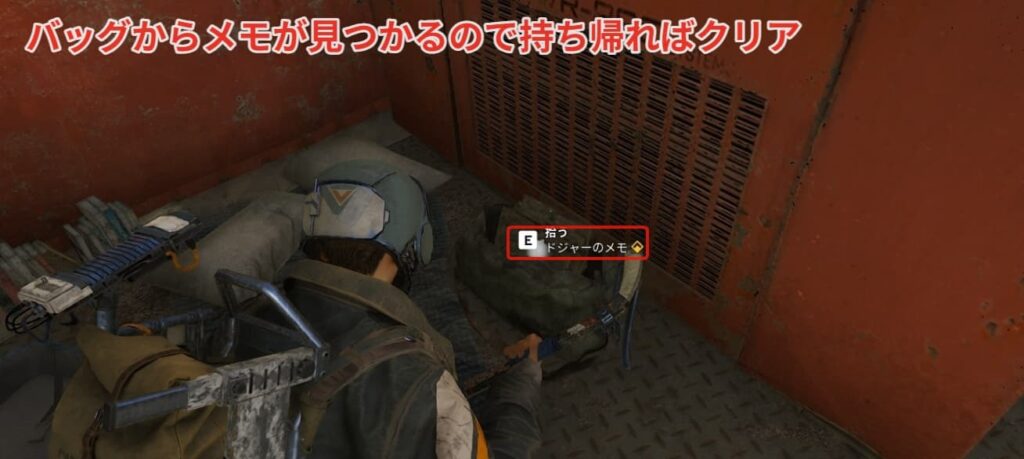 バッグからメモが見つかるので持ち帰ればクリアです。