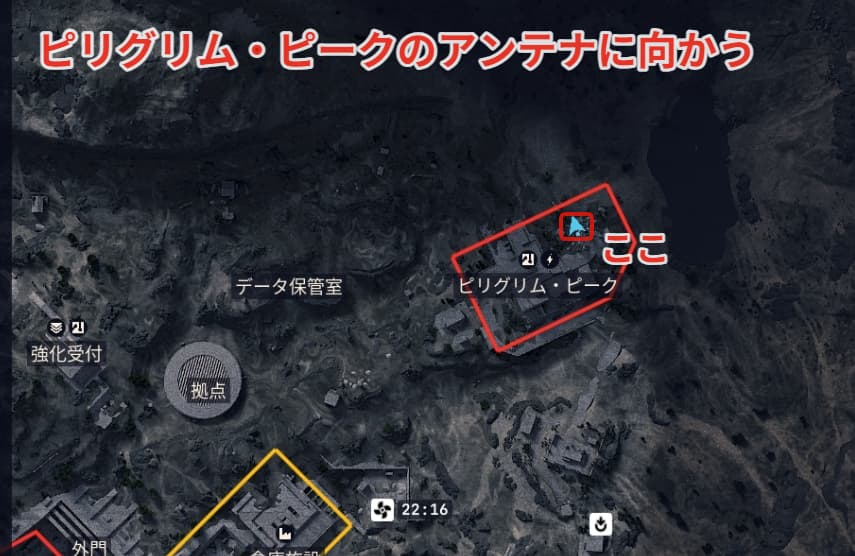 - ②ピリグリム・ピークのアンテナ付近でドジャーの取引場所を探してメモを持ち帰る
