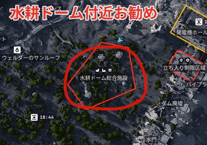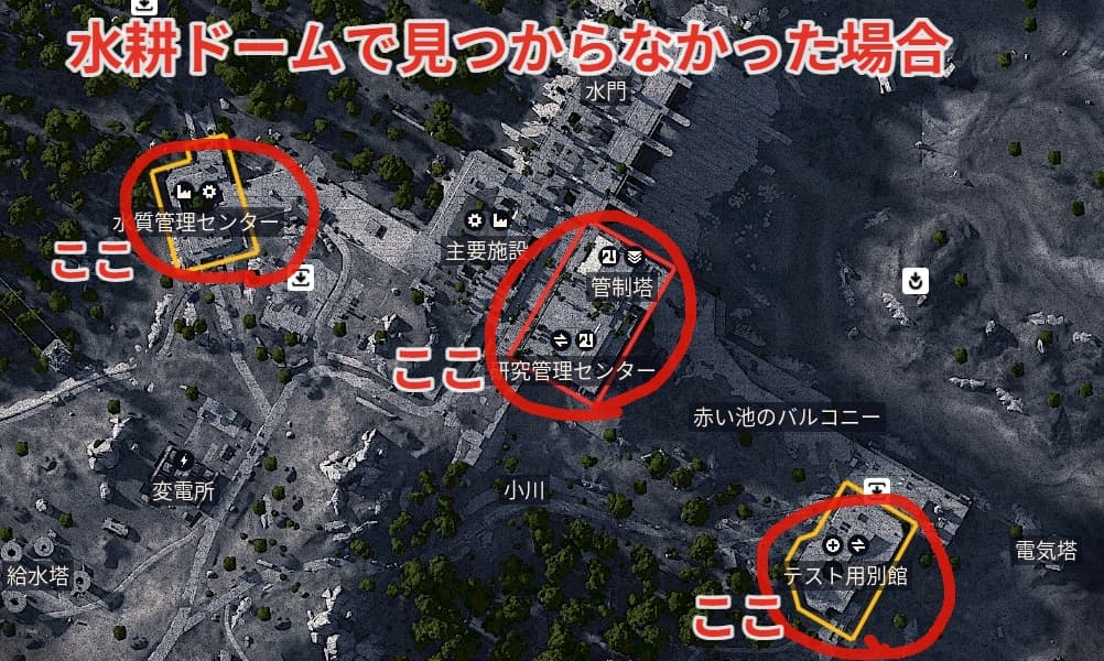 もし水耕ドーム総合施設でファイアボールが見当たらなかった場合は赤丸の施設内で見つけることができます。