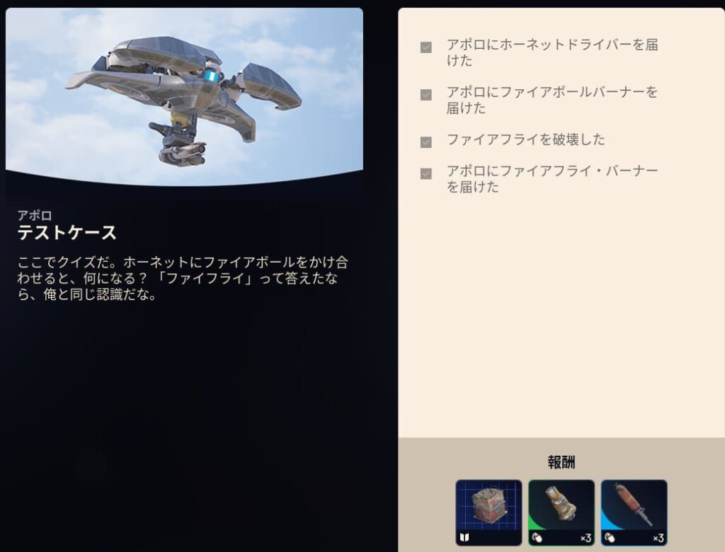テストケースではファイアフライをクエスト受注後に破壊する必要があります。