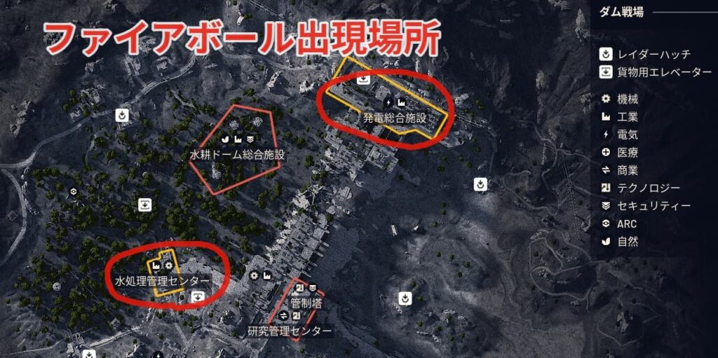 ダム戦場でファイアボールは【発電総合施設】【水処理管理センター】の室内で出現します。