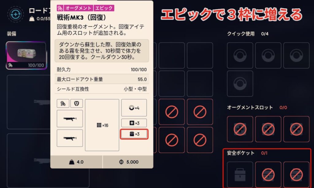 エピック(紫色)のオーグメントまでいくと安全ポケットが3枠まで増加します。