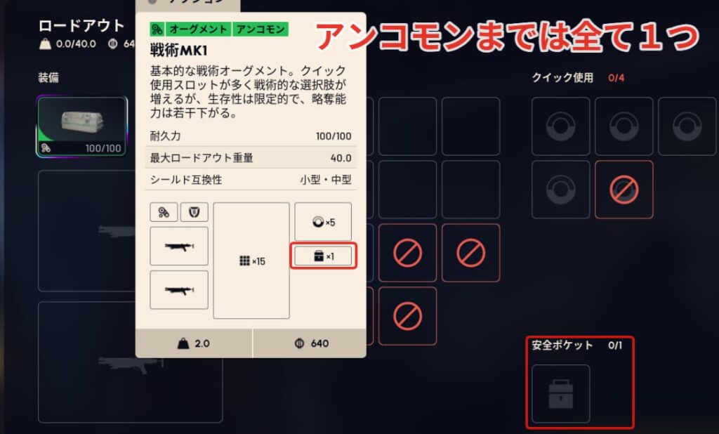 アンコモン(緑色)までのオーグメントは全て安全ポケットは1つです。