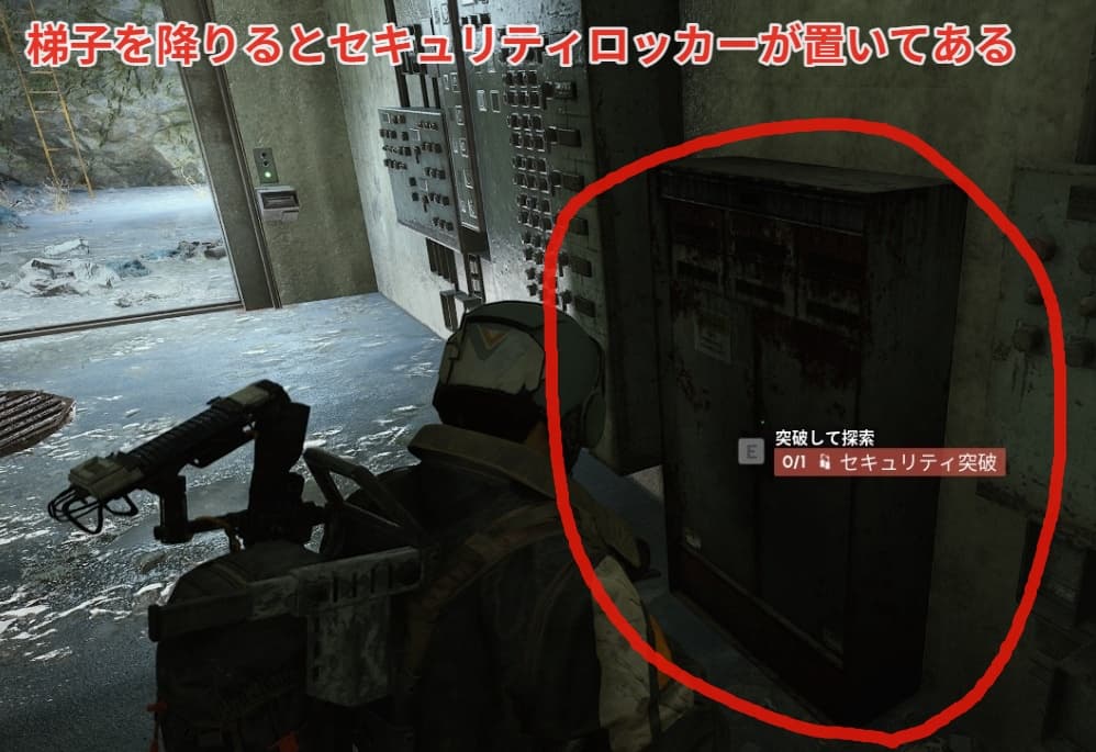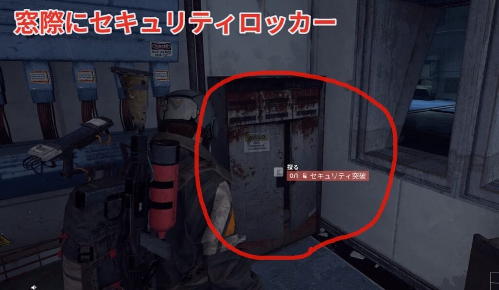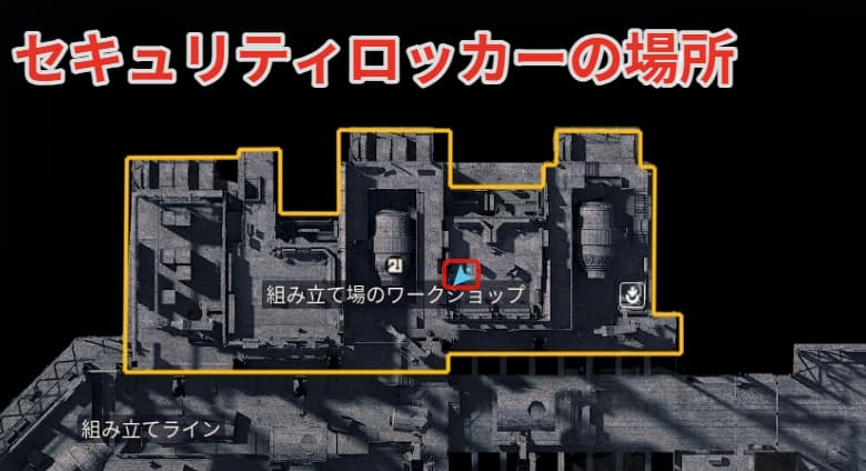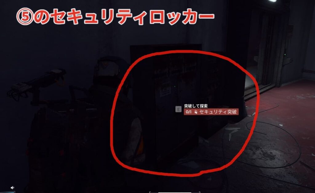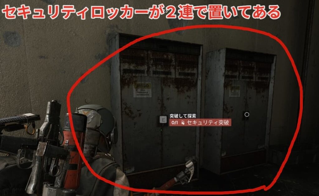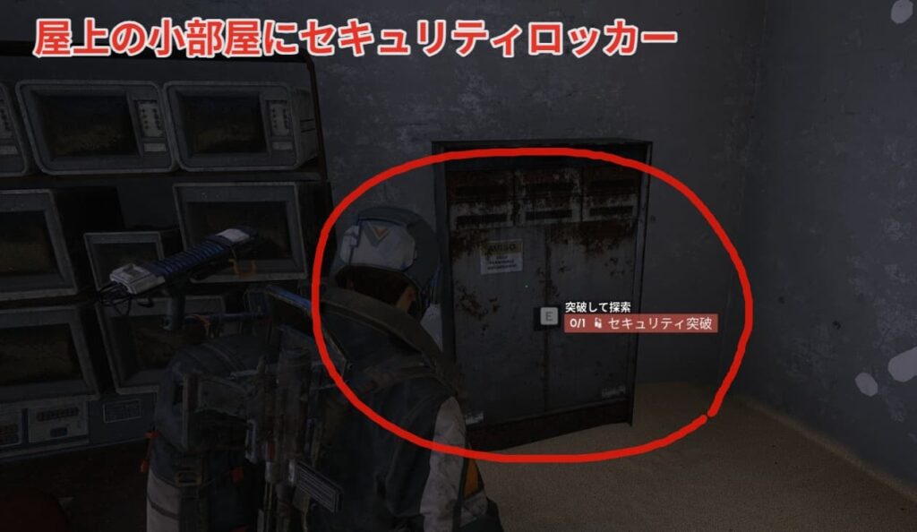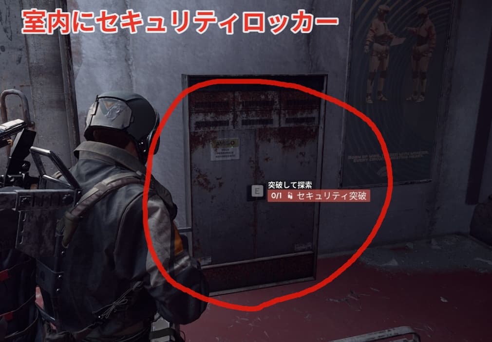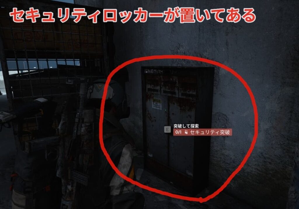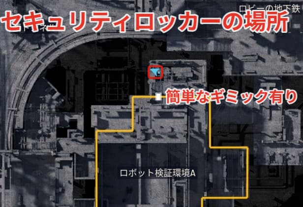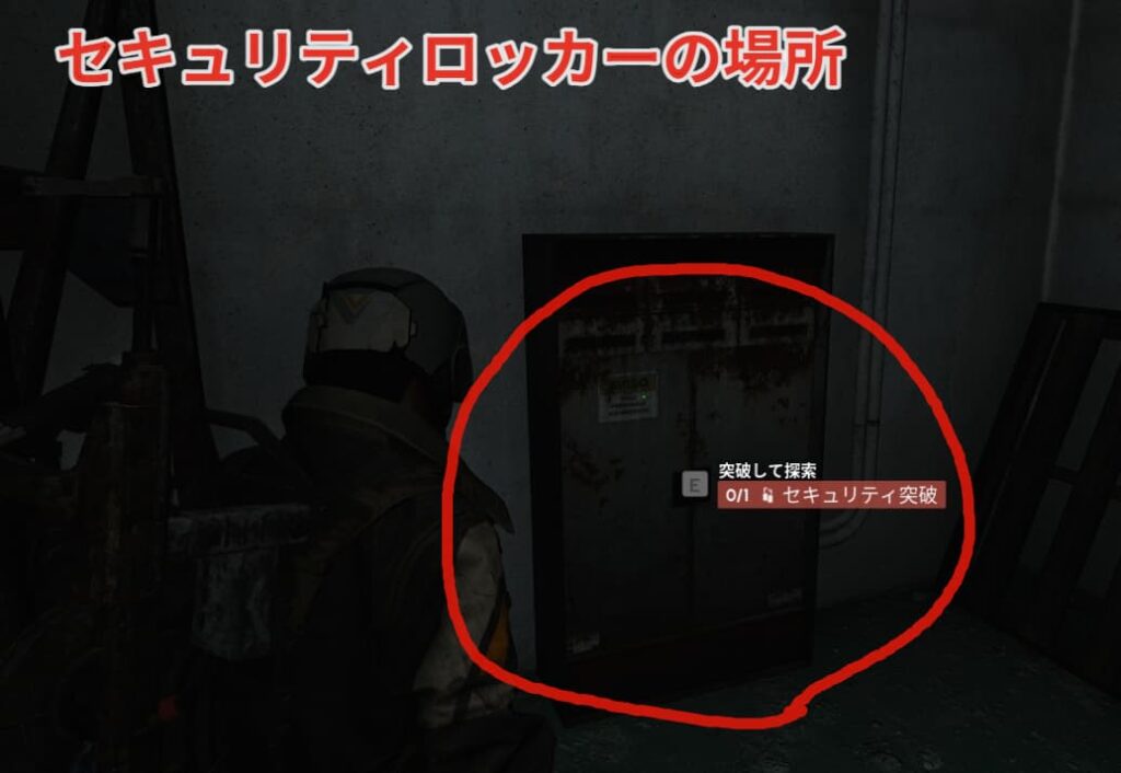 南側の入口から左に向かって進み、突破する扉を開けるとセキュリティロッカーが置いてある。
