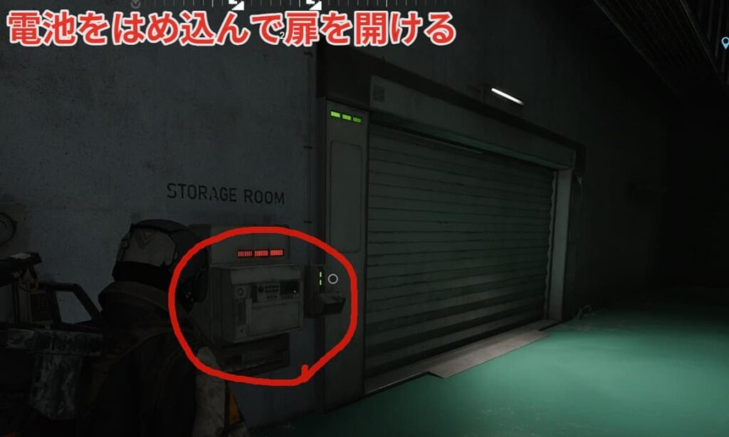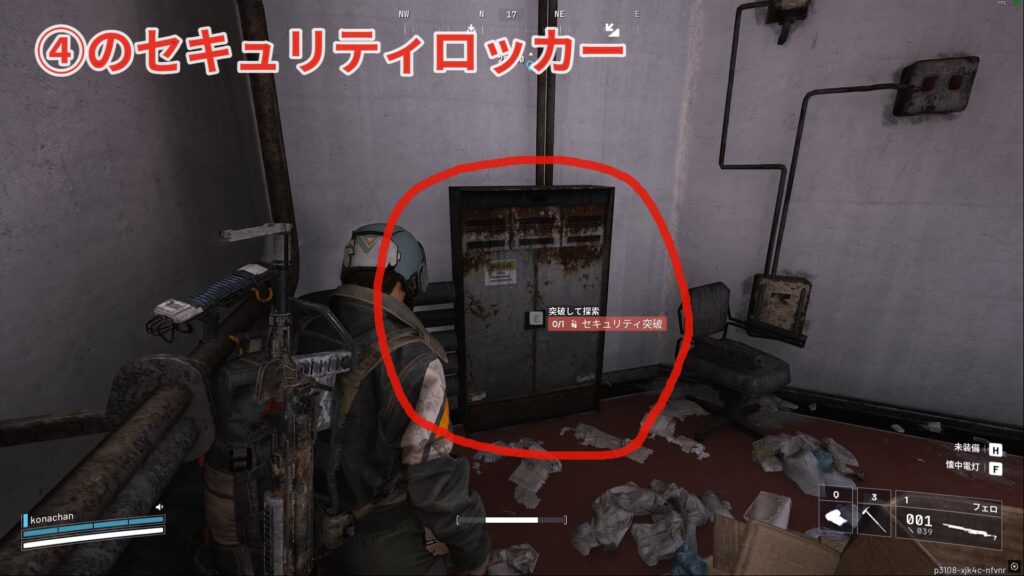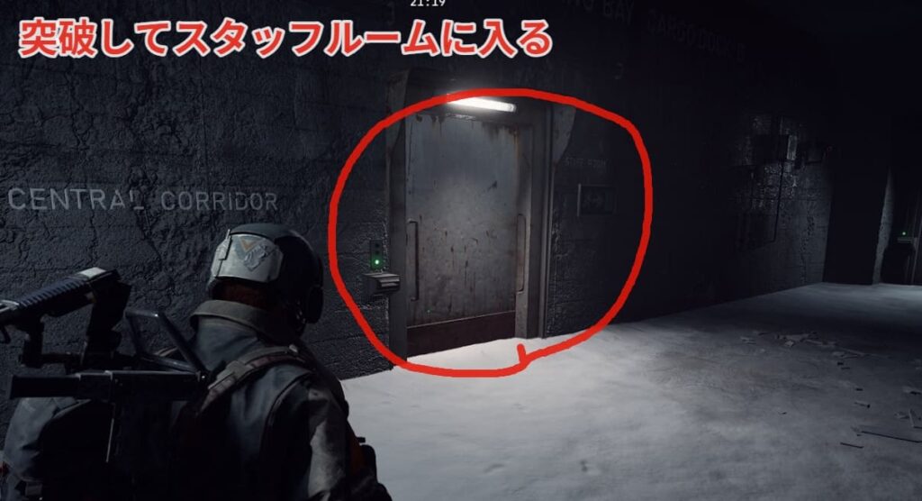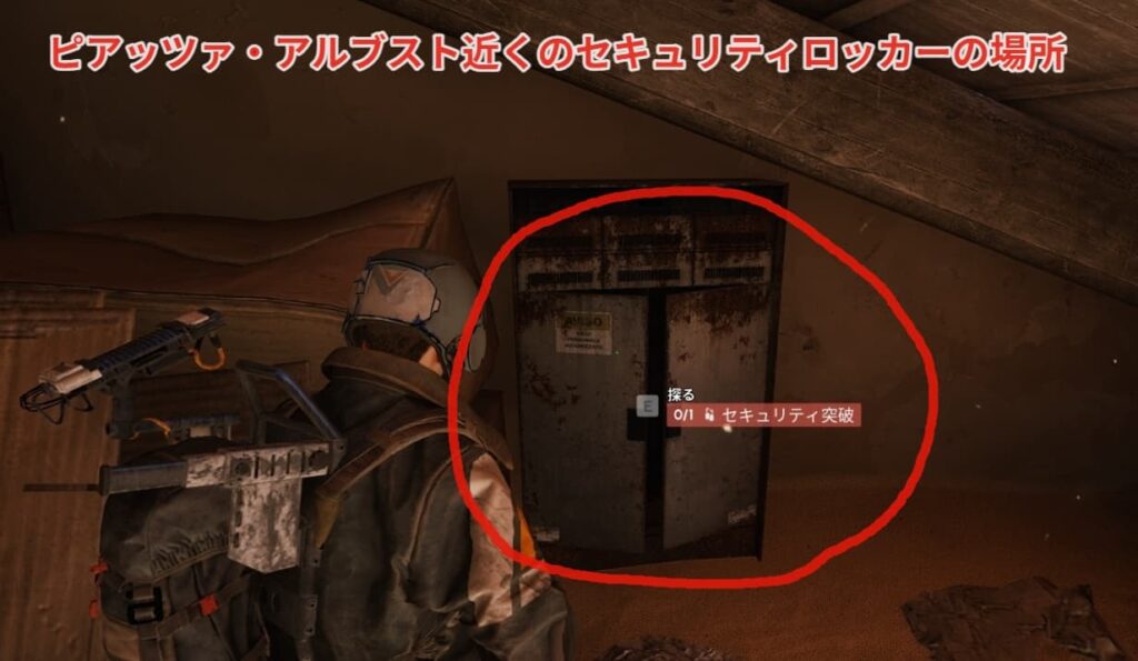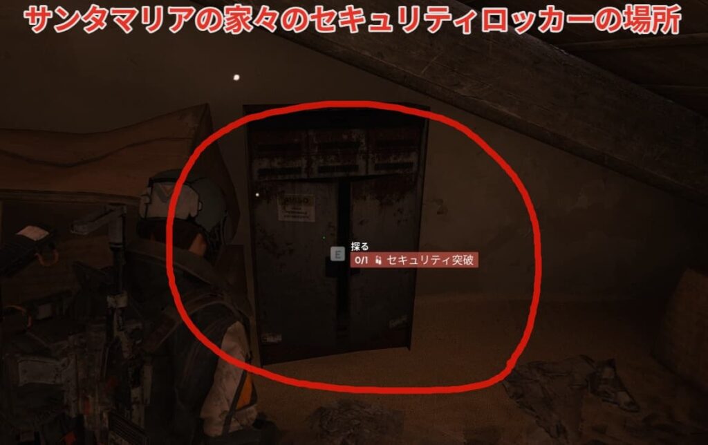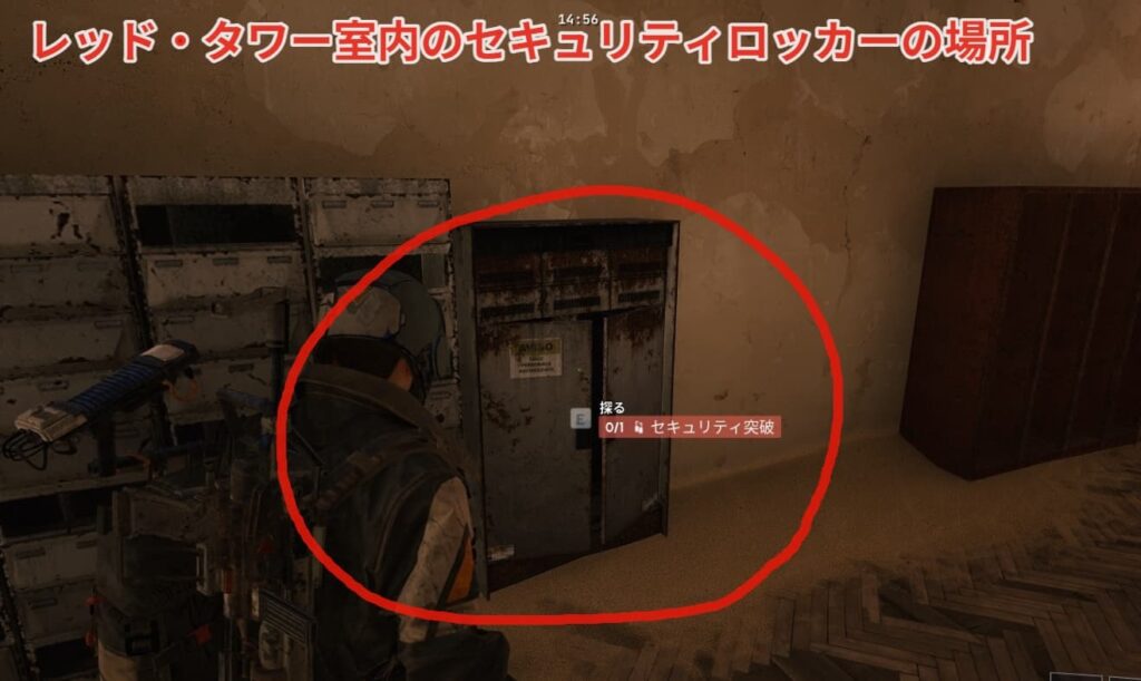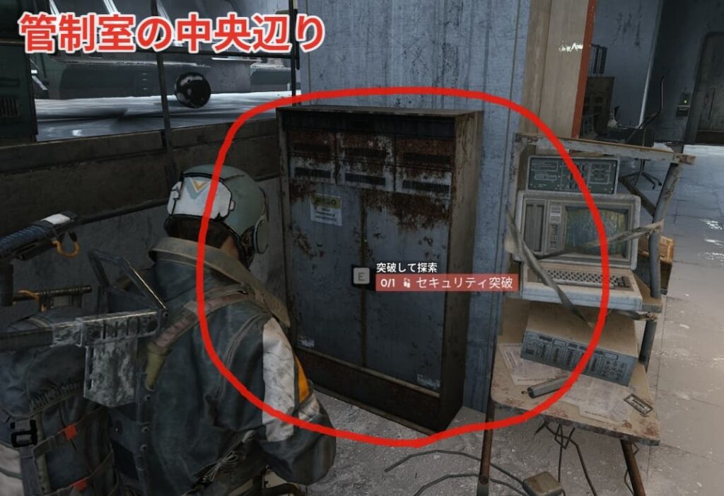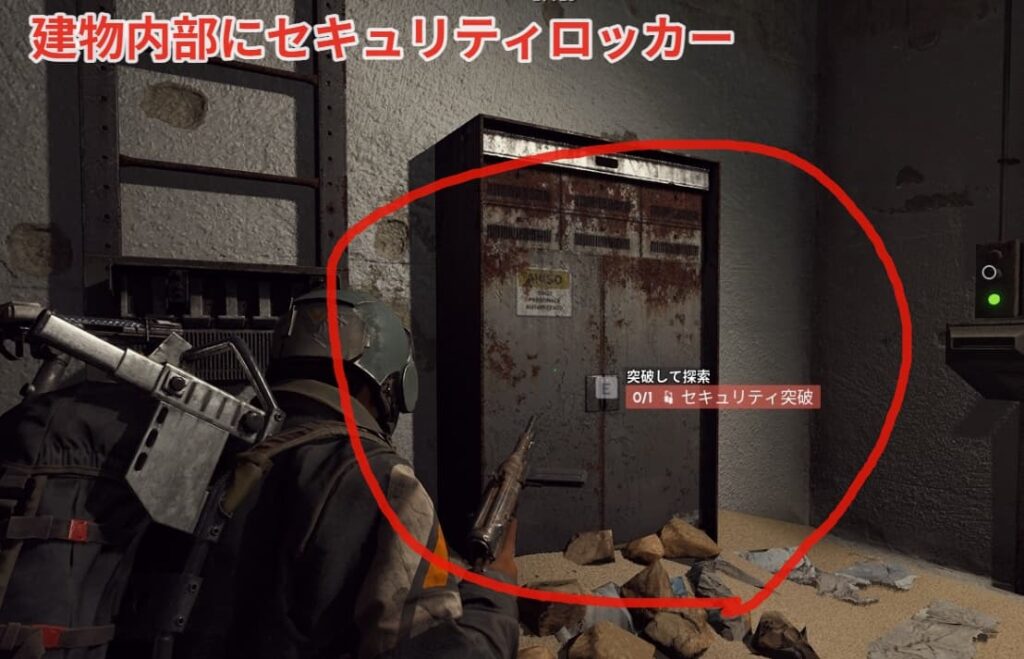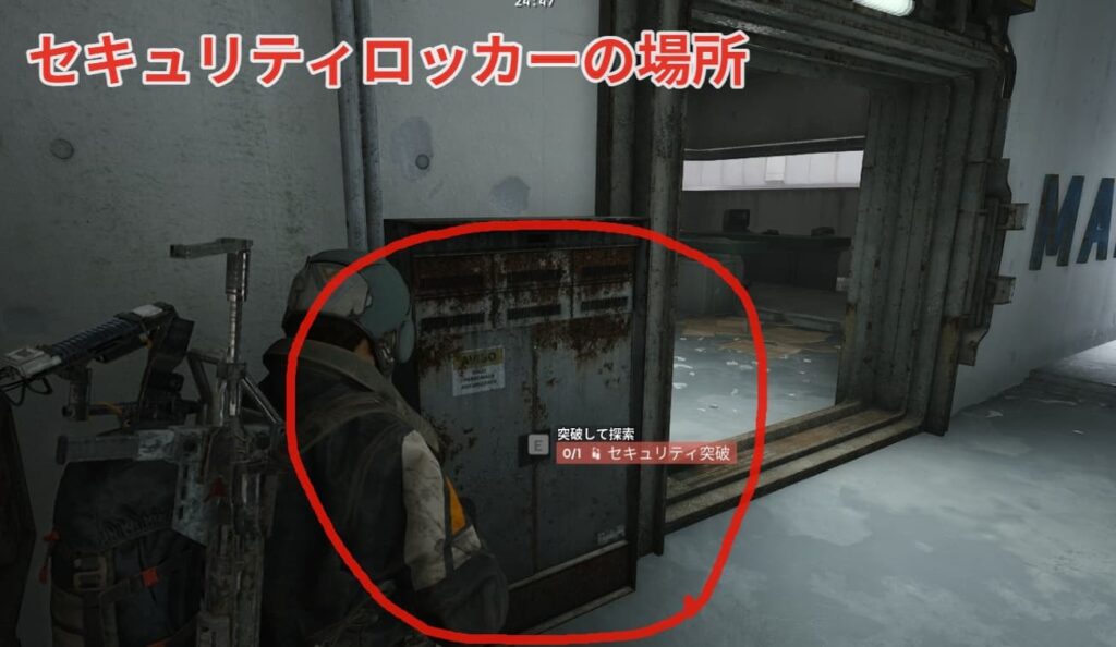 南側の入口から左に向かって進み、突破する扉を開けるとセキュリティロッカーが置いてある。