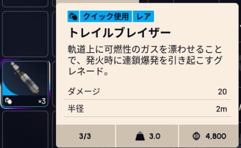 トレイルブレイザーは投げた後にガスが軌道上に発生した後に連鎖で爆発が発生するグレネードです。