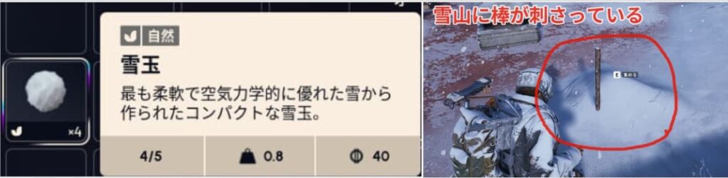 雪玉は寒波時に棒が刺さっている雪山から3秒に1度拾うことができます。
